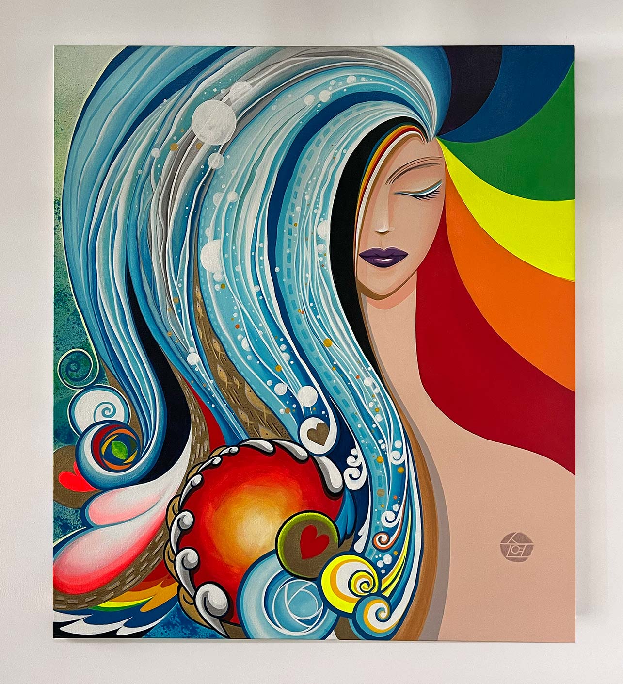 Immerse yourself in “Her Calm Waters,” a poignant piece by Suyeun that captures the tranquil essence of reflection. The artwork features a woman immersed in thought, enveloped by the gentle embrace of calming waters, rendered in vibrant acrylics on canvas. This unique painting stands as a testament to the artist’s profound ability to channel serenity and strength through her brushstrokes, presenting a visual sanctuary for those who seek solace and empowerment. Own this original, 1-of-1 window into a world where tranquility is a treasure held within, perfect for any collector or space that values introspection and the serene power of the feminine spirit.